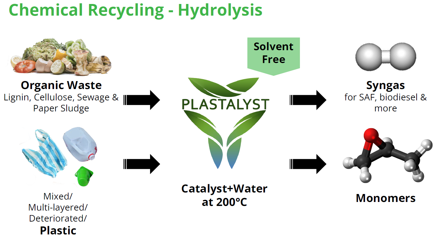 触媒を用いて、200-300 ℃にて混合廃プラや有機廃棄物をモノマー、水素、一酸化炭素、アルコール等に分解します。インドネシアやフランスでパイロットプラントを稼働させております