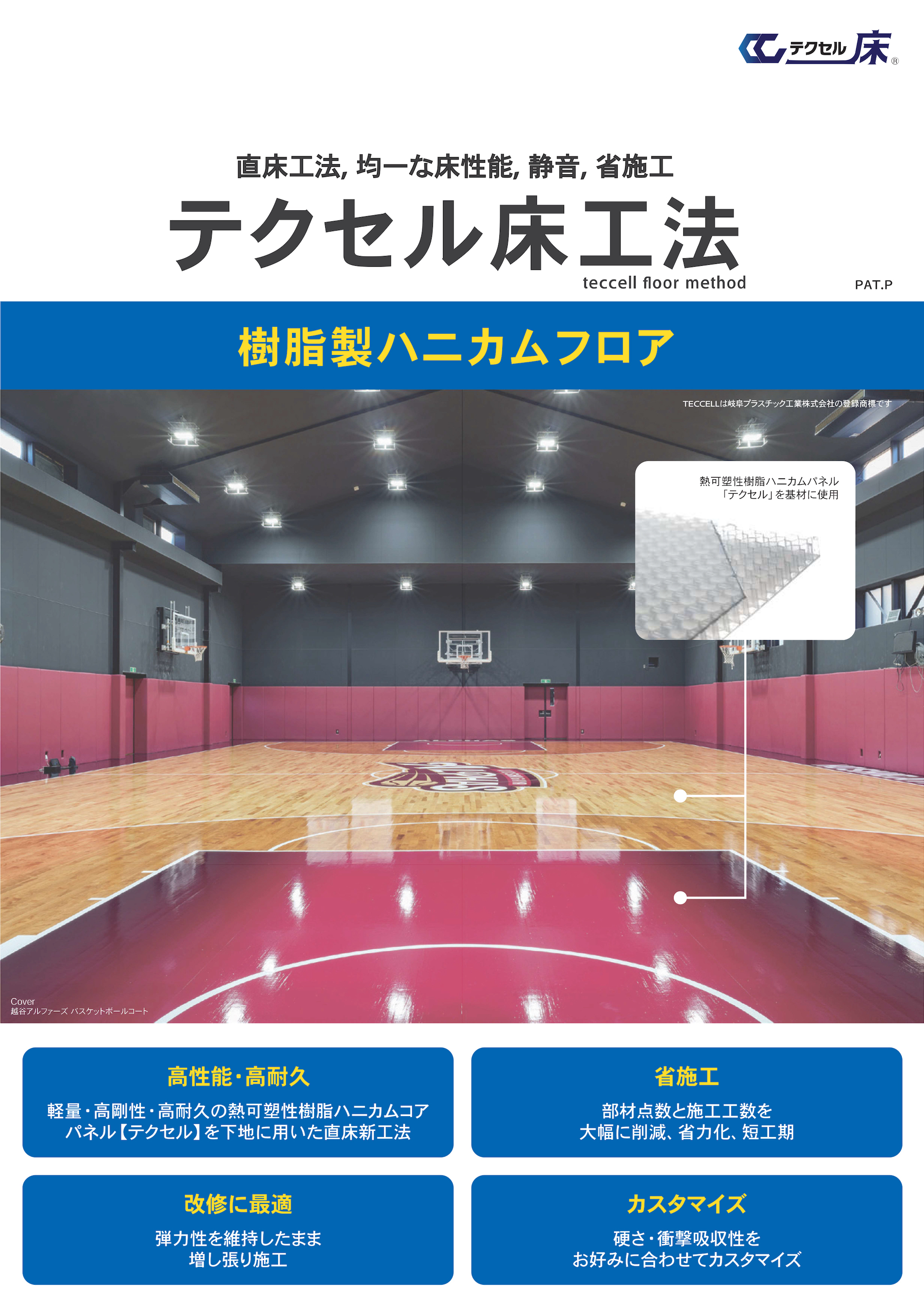 床コンクリートと表層仕上材の間に「TECCELL(テクセル)」パネルを挟み込む直床形式工法で、反発性能を持ったまま、衝撃吸収性を持たせる積層床工法です。TECCELLと弾力層の密度を変えることにより反発性・緩衝性・弾力性をコントロールできます。さらに室内反響も低音域で抑制でき聞き取りやすい環境です。このため多様なスポーツ競技から機能訓練などのリハビリ室など様々なニーズに応える工法です。公共施設等老朽化した体育館床では、既存床を撤去せずテクセル床を増張りする工法を提案します。