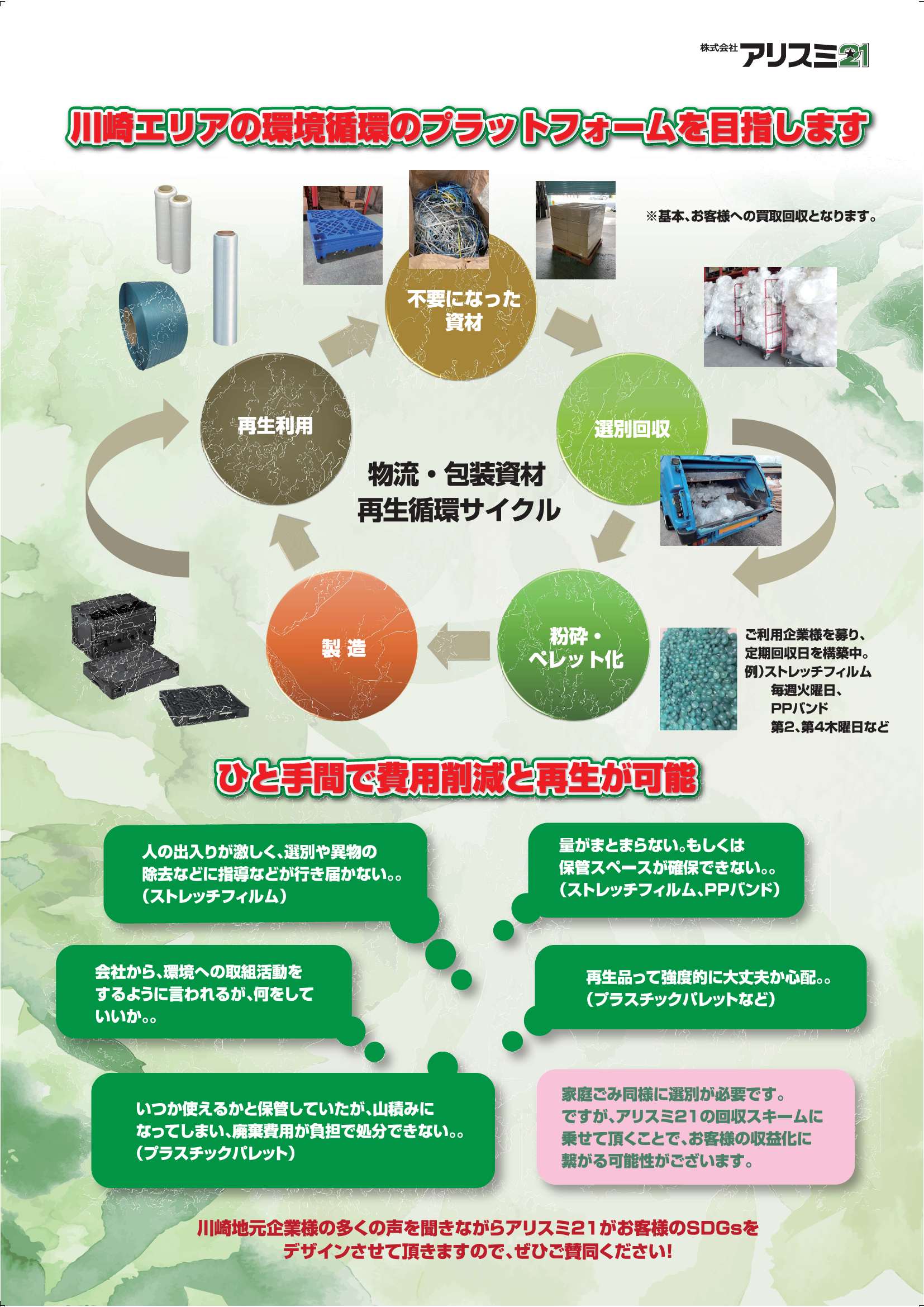 昨今の環境問題の観点から、従来の資材販売でとどまらず、お客様への環境取組みの支援を出来ないかという考えから、不要になったプラスチック資材を再生原料として回収・再生という取組みを始めました。