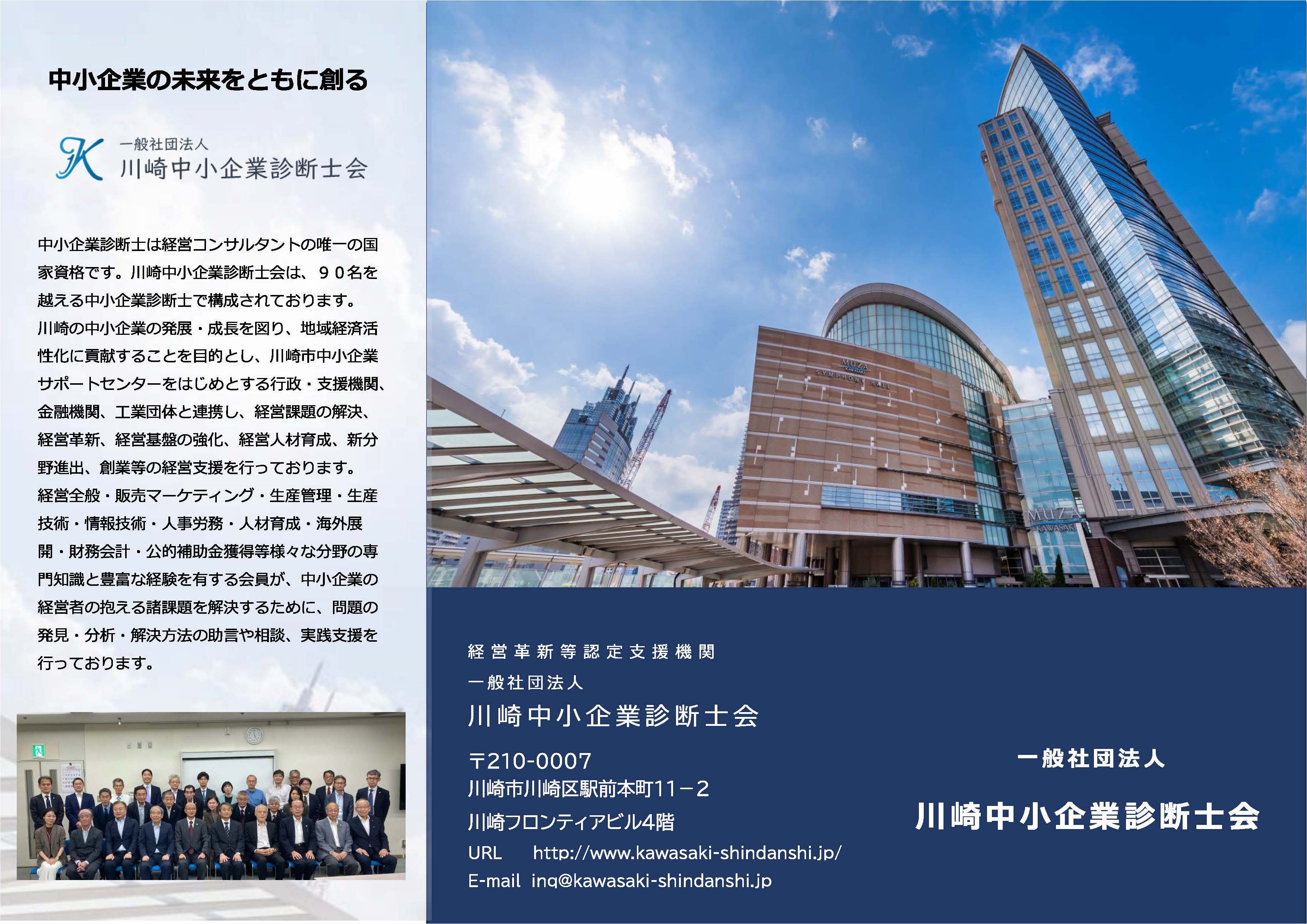 中小企業診断士は経営コンサルタントの唯一の国家資格です。川崎中小企業診断士会は、90名を越える中小企業診断士で構成されております。川崎の中小企業の発展・成長を図り、地域経済活性化に貢献することを目的とし、川崎市中小企業サポートセンターをはじめとする行政・支援機関、金融機関、工業団体と連携し、経営課題の解決、経営革新、経営基盤の強化、経営人材育成、新分野進出、創業等の経営支援を行っております。