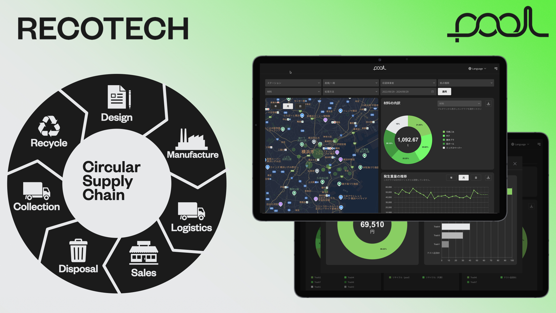 poolは、資源価値の終わりを始まりに変えるクラウドサービスです。都市資源をpoolでデータ化することによって回収効率を高め、リサイクル材料を活用したい製造業者と排出事業者を繋ぎ合わせて循環型サプライチェーンをデザインします。ごみの発生から、運搬、リサイクルのすべての過程で、スマホやタブレットで簡単に情報連携することで、リサイクル材を活用する上で欠かせない「どこから」「どのようなプロセス」を経てリサイクルしたかのトレーサビリティ情報とスコープ3カテゴリ1・5のCO2排出量情報を提供します。