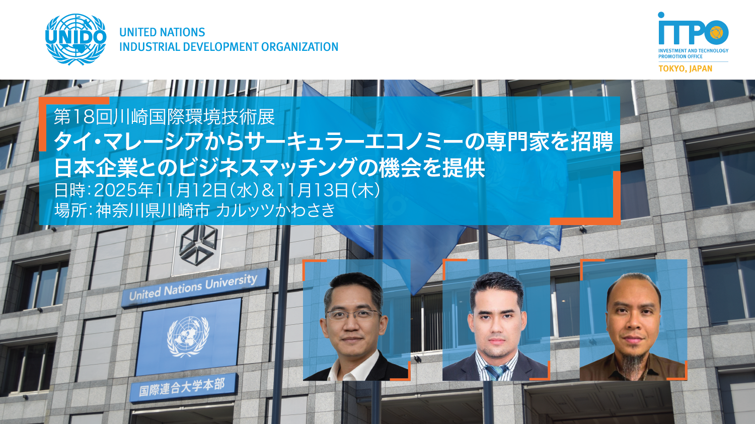 本展示会では、タイ王国とマレーシアより環境分野の専門家数名を日本に招聘し、海外展開を検討される日本企業向けに情報提供・商談の機会を設ける予定です。詳細はUNIDO東京事務所ウェブサイトでも紹介します!