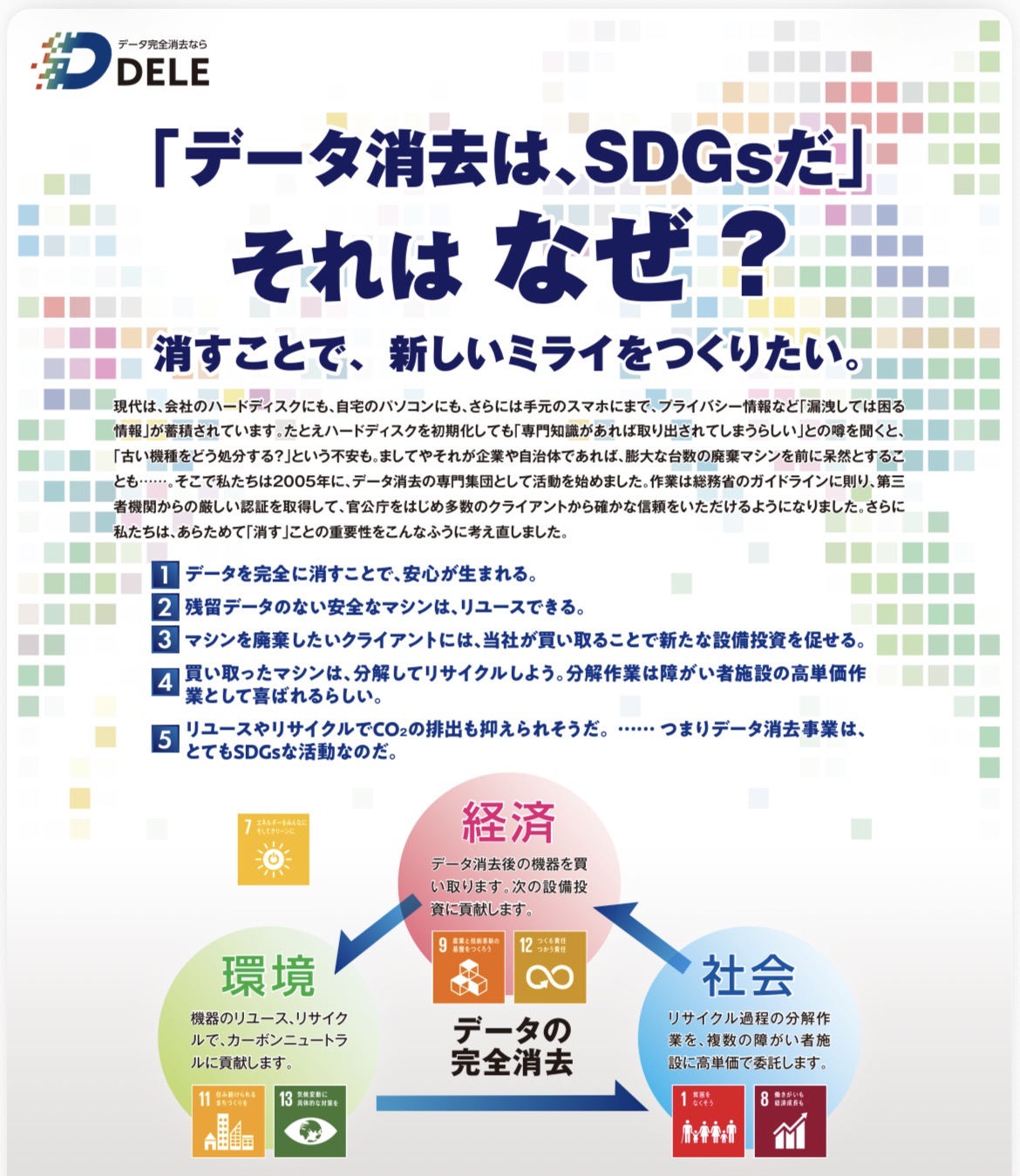 当社は「消す=Delete」のプラットフォーマーを目指しています。データを消すことで人々の不安も消していきたいのです。これから企業の取り組みとして「環境や社会への責任を果たしているのか、また果たそうとしているのか」が重視されます。当社としてSDGsを経営に落とし込み、新たな企業価値を創造しながらイノベーションの源泉を生みだしてまいります。