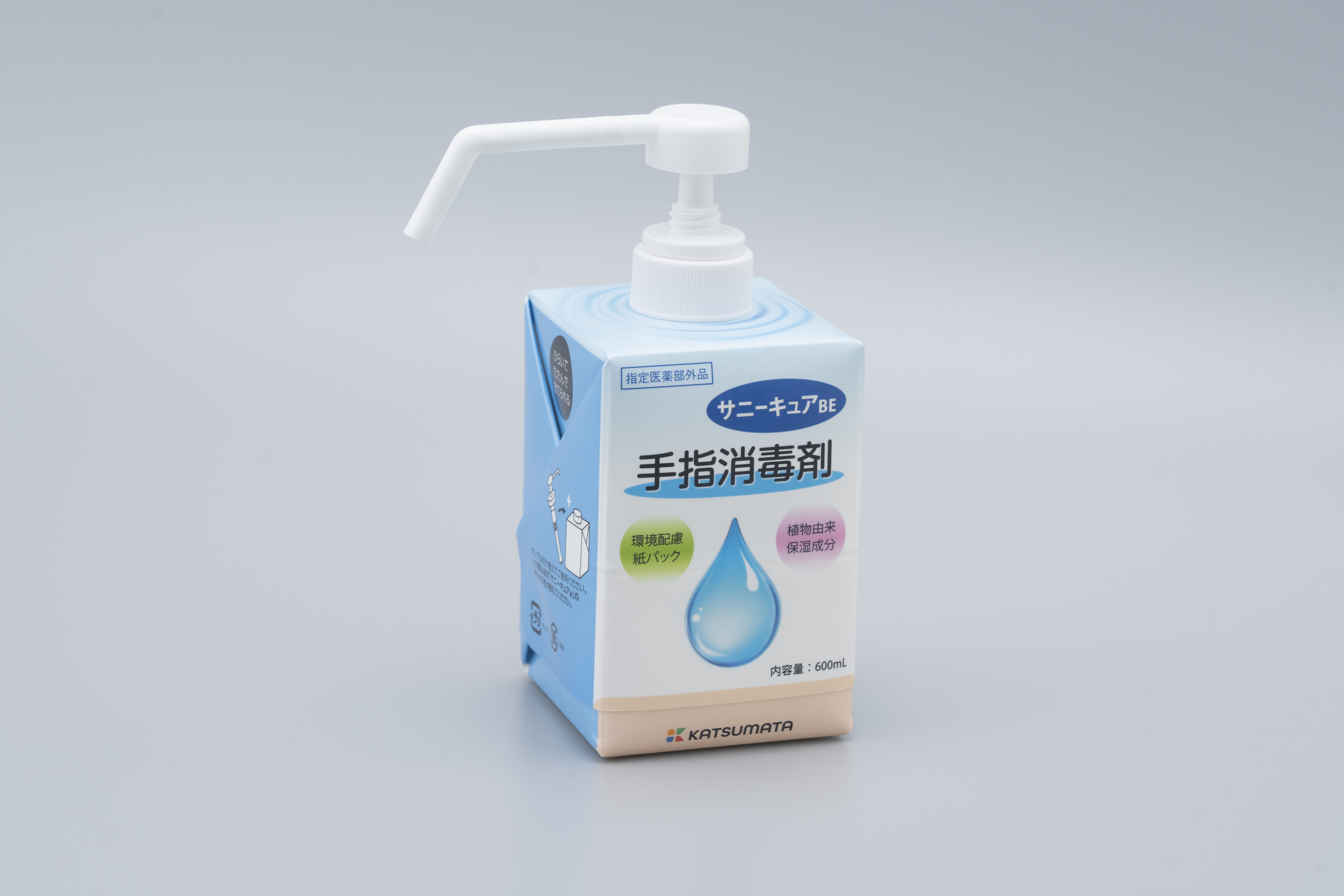 〔サニーキュアBE〕は、【3R+Renewable】全てを落し込んだ〔紙容器製・ポンプ付き手指消毒剤(指定医薬部外品)〕。Reduce;プラスチック廃棄量削減。Reuse;ポンプ部の耐久性を向上。付替え用ボトルへ再使用。Recycle;容器を紙資源として再利用。Renewable;容器は〔FSC認証〕紙を使用。 BOXタイプの為、積載効率も良く、輸送によるCO2排出量を削減。溶剤は、植物由来の保湿成分配合で肌に優しい。使用後は、コンパクトに折り畳める。付替え用に〔ポンプ無し〕製品も有。