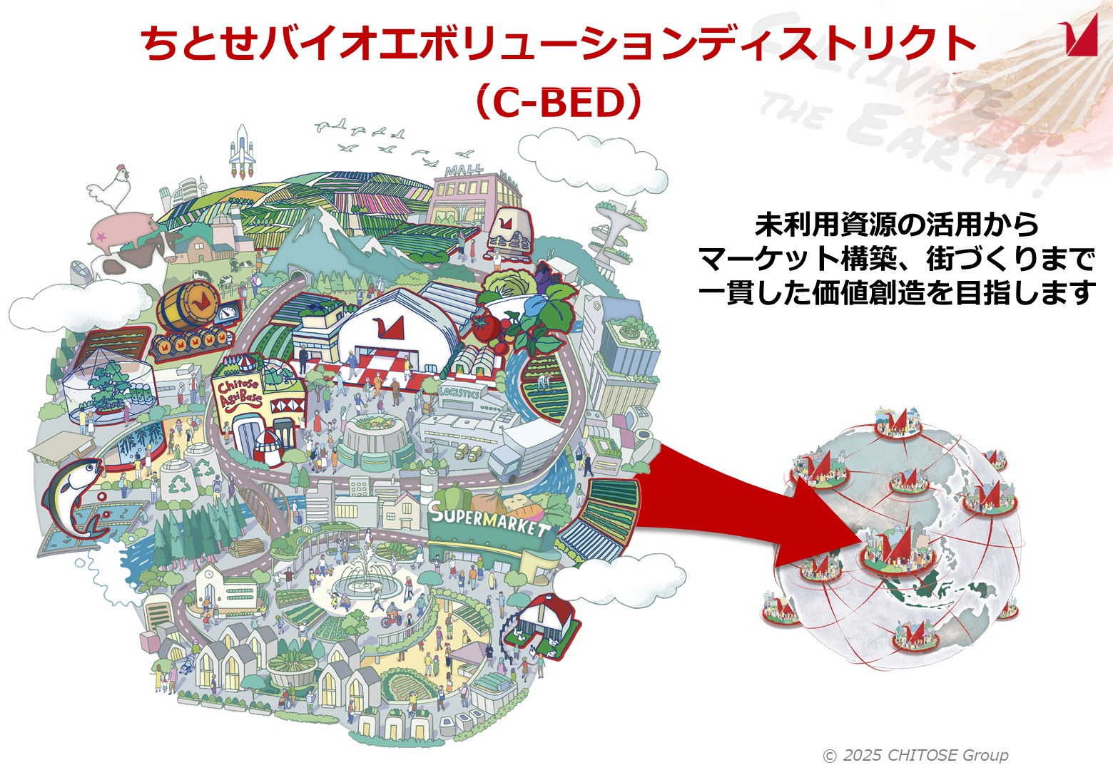 これまでの大規模一極集中型からバイオマスを基点とした分散型社会への移行を目指し、循環型の拠点『ちとせバイオエボリューションディストリクト(C-BED)』の実現を推進しています。有機性廃棄物を未利用資源として再定義し、AIを用いた統合的なバイオプロセスを通じて、多様なプロダクトとそのマーケットを同時に構築することで、経済的にも環境的にも合理的な循環システムを確立します。